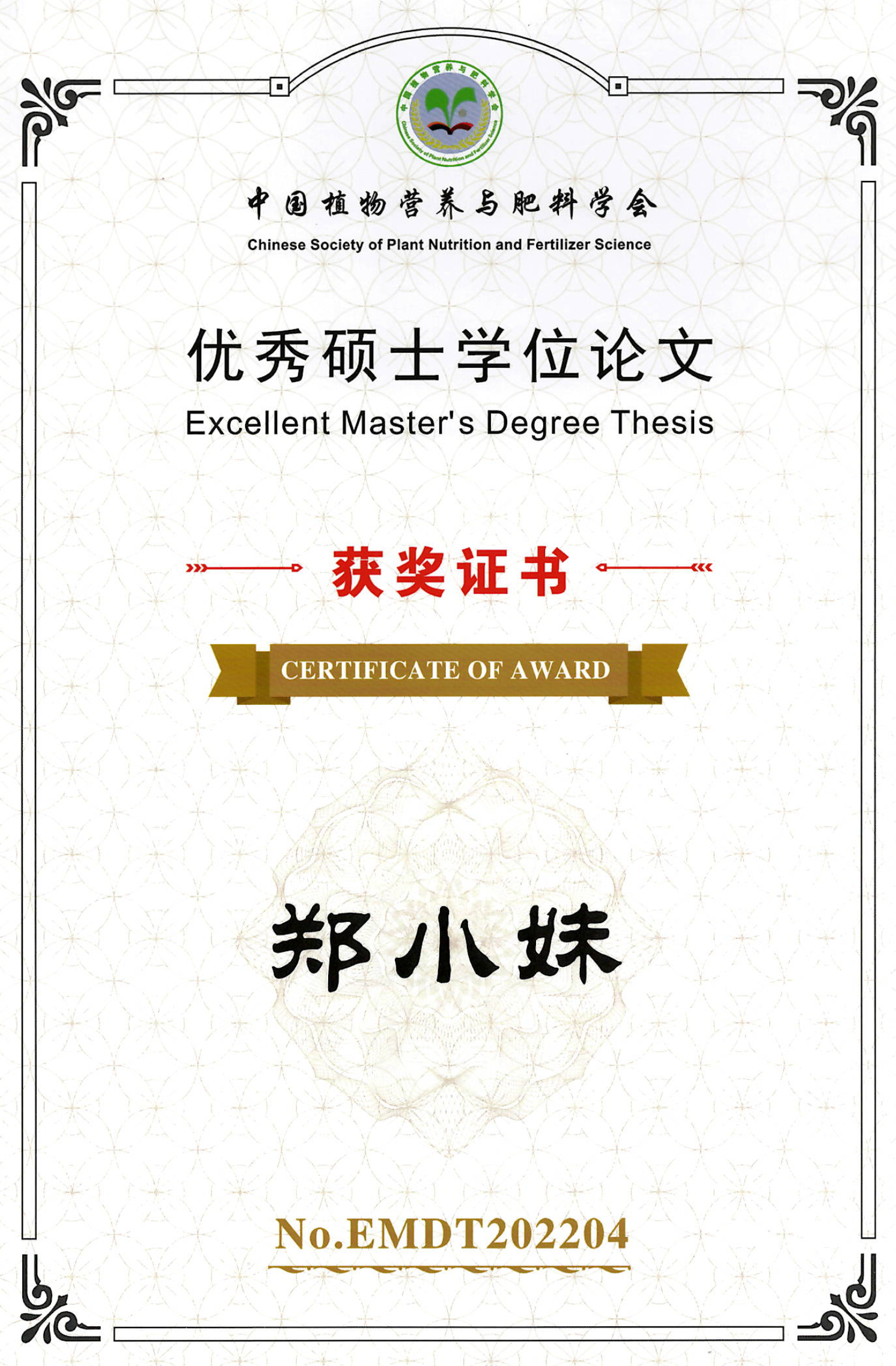 由我院吴建富和魏宗强联合指导的2021届农业资源与环境专业植物营养学方向的硕士研究生郑小妹的硕士学位论文《红壤性水稻土硅有效性及水稻生长对土壤酸化和磷添加的响应》荣获中国植物营养与肥料学会第六届优秀硕士学位论文,吴建富和魏宗强两位指导老师也荣获硕士学位论文优秀指导教师。