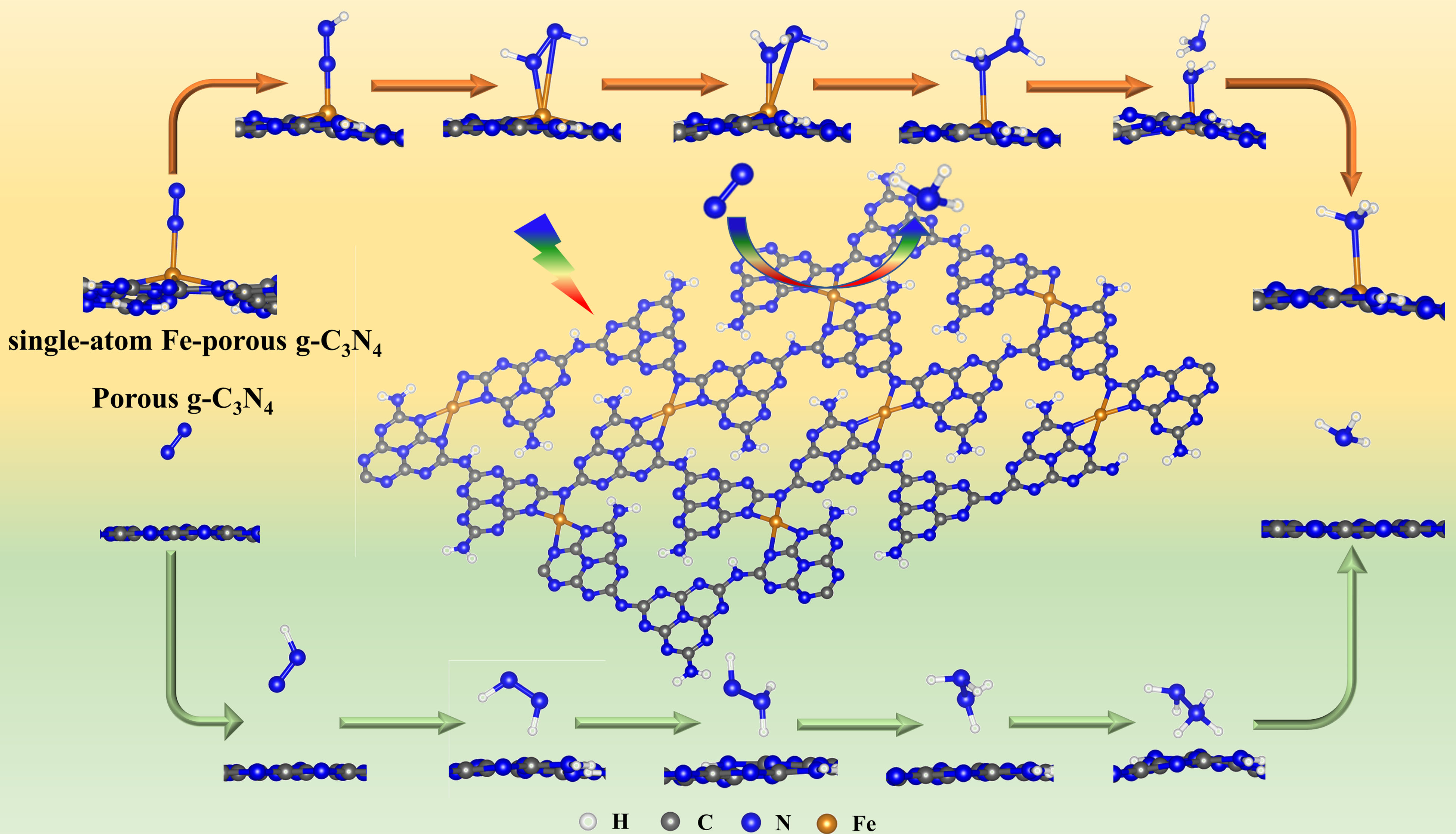 近日,我院2021级农业资源与环境研究生胡彤在《Journal of Materials Science & Technology》(中科院1区, IF2023 = 10.9)上发表研究论文“Facile synthesis of Fe single-atom porous photocatalysts via direct metal atomization achieving efficient photocatalytic nitrogen fixation”。该研究通过气泡模板法和金属直接原子化一步制备了Fe单原子负载孔状氮化碳复合光催化剂(FPx)。实验结果和DFT计算表明,负载Fe单原子后,光催化剂吸附N2的方式由物理吸附转向化学吸附。同时,光催化固氮反应路径由缔合远端路径转变为缔合交替路径。FPx具有多孔结构,能够暴露出更多的活性中心。因此,FP3(负载3wt.%Fe)具有最佳的光催化固氮性能,明显优于孔状氮化碳(PCN)和块状氮化碳(BCN)。本研究为构建单原子光催化剂以实现高效的光催化氮还原提供了新思路。