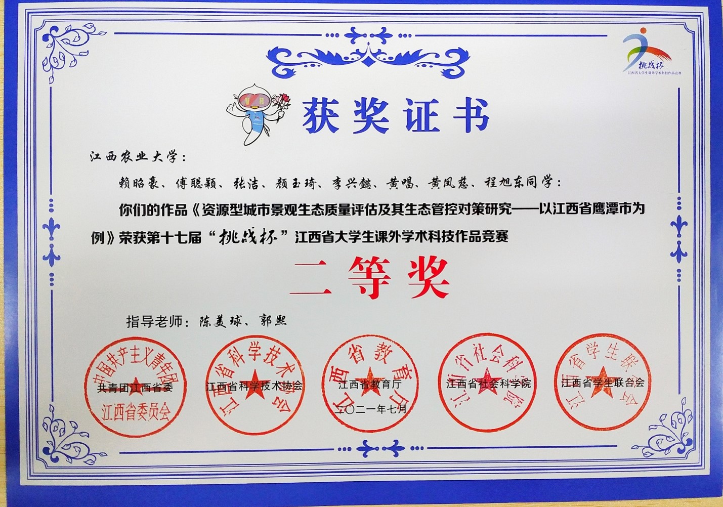 20217月,我院陈美球老师课题组的2018级土地资源管理研究生赖昭豪等8人的作品《资源型城市景观生态质量评估及其生态管控对策研究——以江西省鹰潭市为例》荣获第十七届“挑战杯”江西省大学生课外学术科技作品竞赛二等奖。