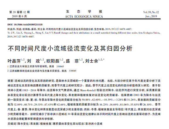 2017级农业资源利用研究生叶晶萍在《生态学报》上发表了论文《不同时间尺度小流域径流变化及其归因分析》(通讯作者:刘士余教授)。该论文揭示了彭冲涧小流域近30年来径流变化规律以及不同时间尺度上影响径流的主要驱动因子,为流域水资源合理配置和管理提供科学依据。
