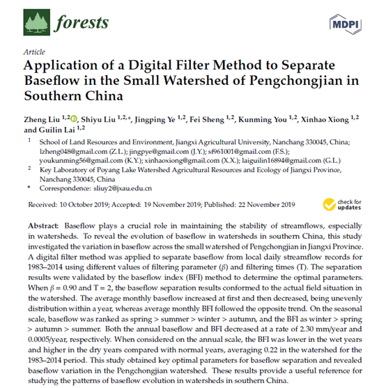 2017级土壤学研究生刘政在SCI期刊《forests》(2019年IF=2.116)上发表了论文《Application of a Digital Filter Method to Separate Baseflow in the Small Watershed of Pengchongjian in Southern China》(通讯作者:刘士余教授)。该研究得到了彭冲涧小流域基流分割的最优参数,并揭示了流域基流的变化规律。