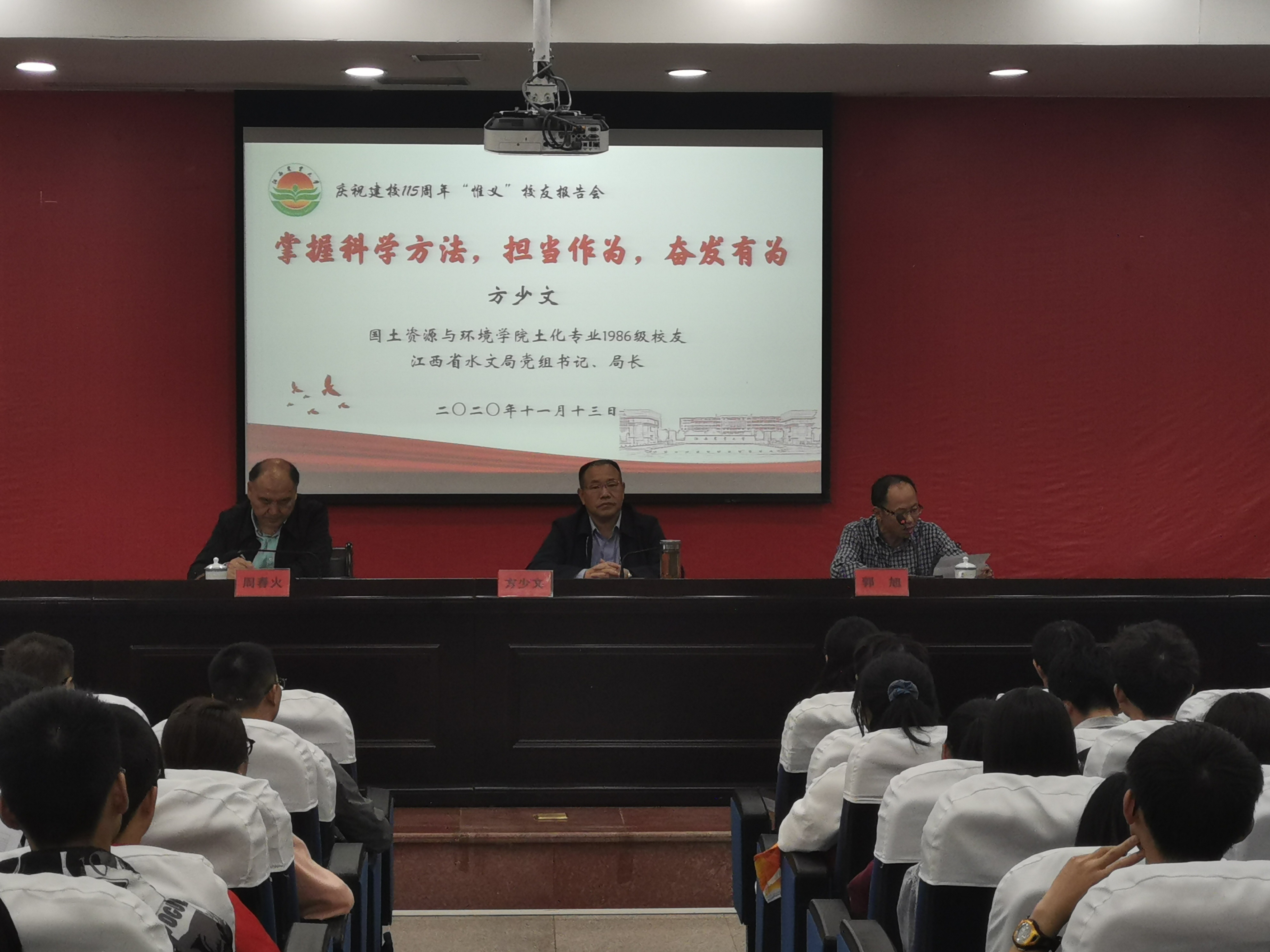 1113日下午,江西省水文局党组书记、局长、bat365中文官方网站土化专业1986级校友方少华应邀来学校作题为《掌握科学方法,担当实干,奋发有为》的专题报告,国土学院党委书记郭旭、副院长周春火以及各专业师生代表参加了此次报告会,会议由国土学院党委书记郭旭主持。