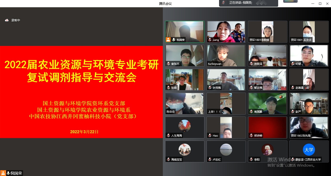 “疫情防控工作开展到哪里,党组织的战斗堡垒作用就发挥到哪里”,学院坚持以党建引领防疫工作,进一步明确工作职能,指导各基层党组织采取线下线上结合的方式,及时开展相关工作,充分发挥党组织的政治引领、统筹协调、宣传发动、思想疏导作用,有效地把党的组织优势转化为工作优势。当前是考研复试调剂的关键期,学院全体领导班子对接支部一起为学生想点子、出对策、给思路,尽最大努力保证考研学子复试顺利,一战成“硕”。3月22-23日,学院五大系,四个党支部开展“研途顺利,我们站在‘疫’起”线上主题党日活动。土管地信系党支部书记朱泰峰老师结合近年社会岗位需求和专业学科发展趋势就考研学子复试有关面试技巧进行分析并邀请往届调剂成功学子进行了经验分享;资源环境系党支部赵尊康、宗强老师结合各大高校研究生招考工作实际对学生寻找调剂院校信息和导师提供了方法思路;旅游水利系教工党支部则通过整合调剂信息给10位考研调剂学生进行一对一院校匹配……