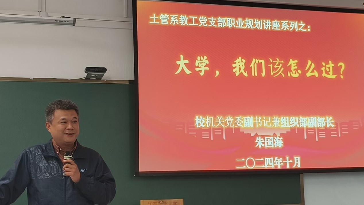 10月29日,在即将迎来119周年校庆之际,我院98级土地利用与规划专业校友、校机关党委专职副书记兼组织部副部长朱国海应邀为我院师生做职业规划讲座。讲座由院党委副书记马慧琴书记主持,土管系教师、土地资源管理专业、地理信息科学专业全体大一新生共140余人参加了讲座。
