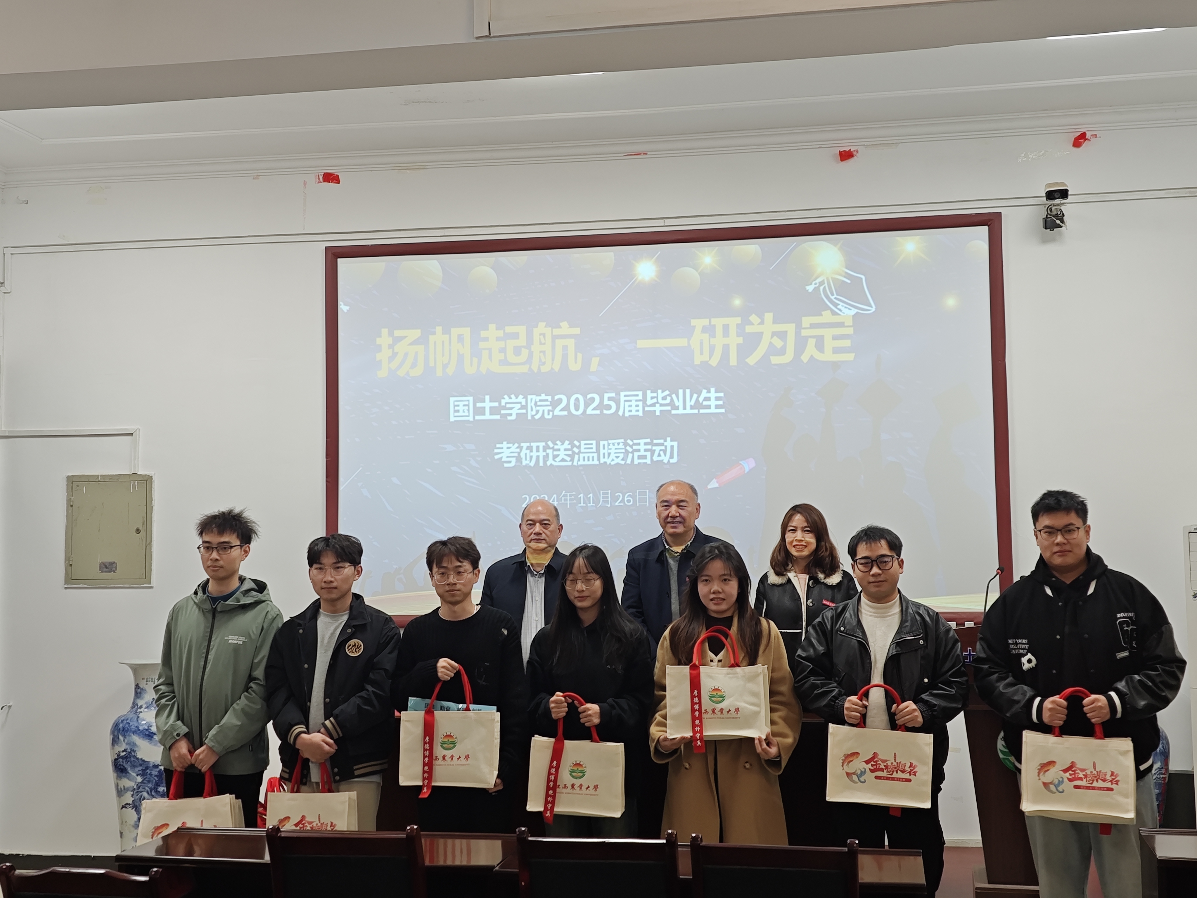 为缓解考研学子备考压力,11月27日下午,国土bat365中文官方网站“扬帆起航,一‘研’为定”--2025届本科毕业生送温暖活动。院党委书记李保同、院长周春火、院党委副书记马慧琴和学工办老师为2025届考研学生送上温馨祝福、温暖礼物。