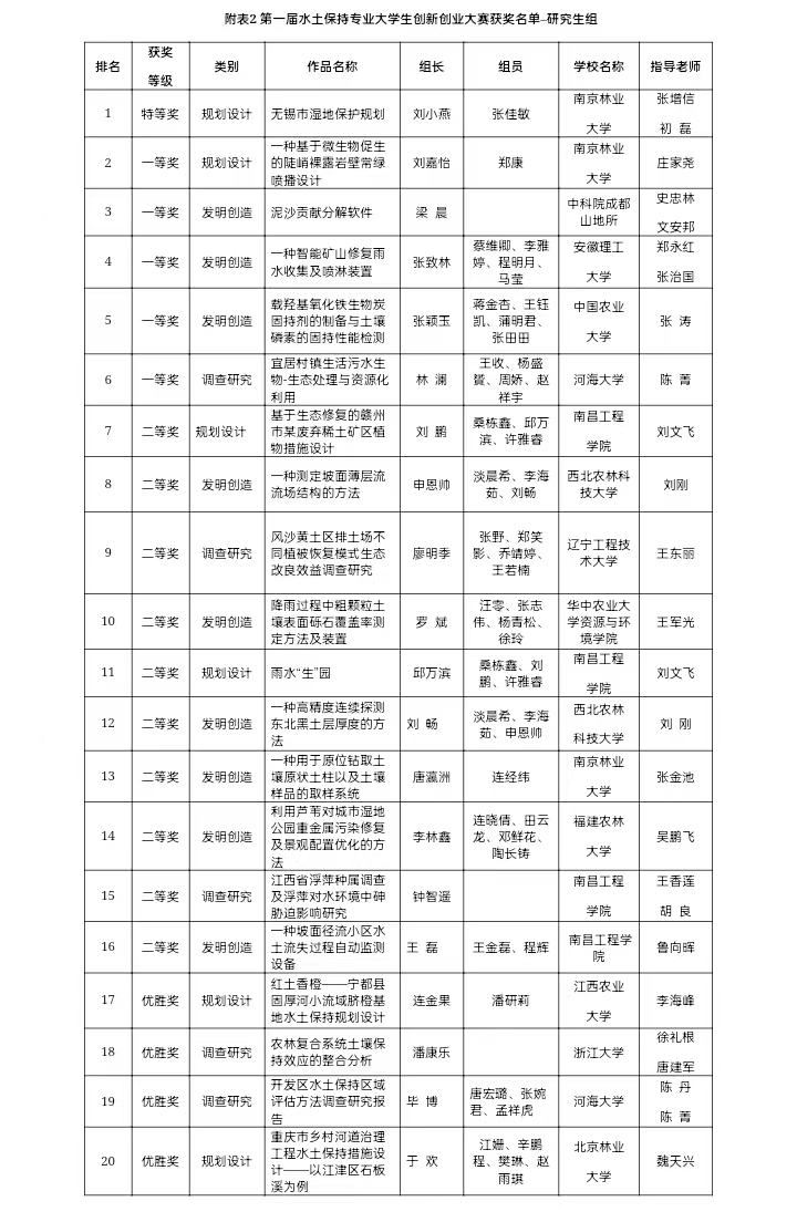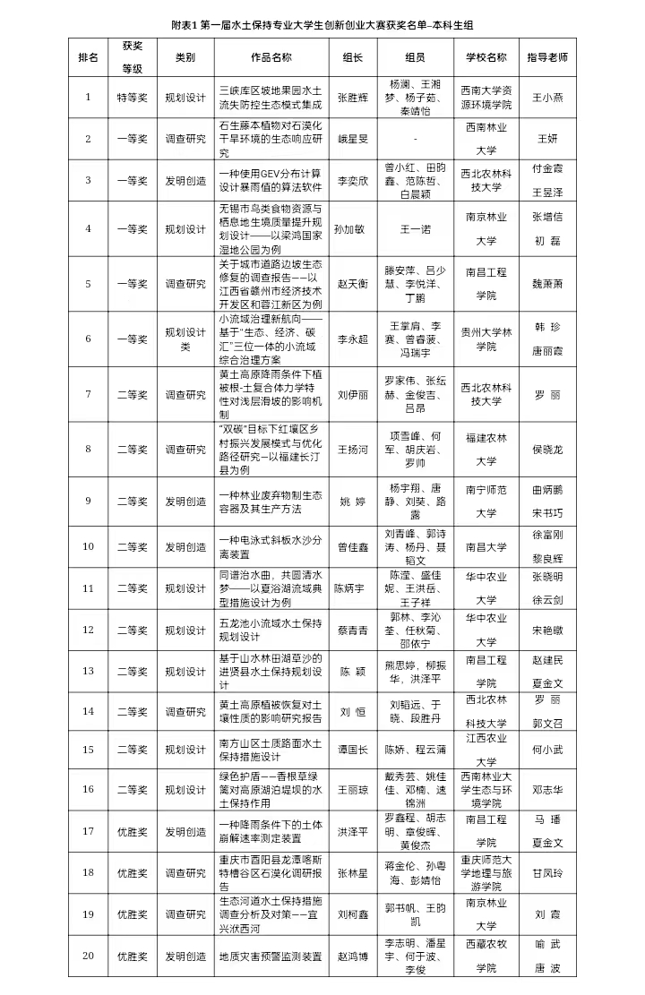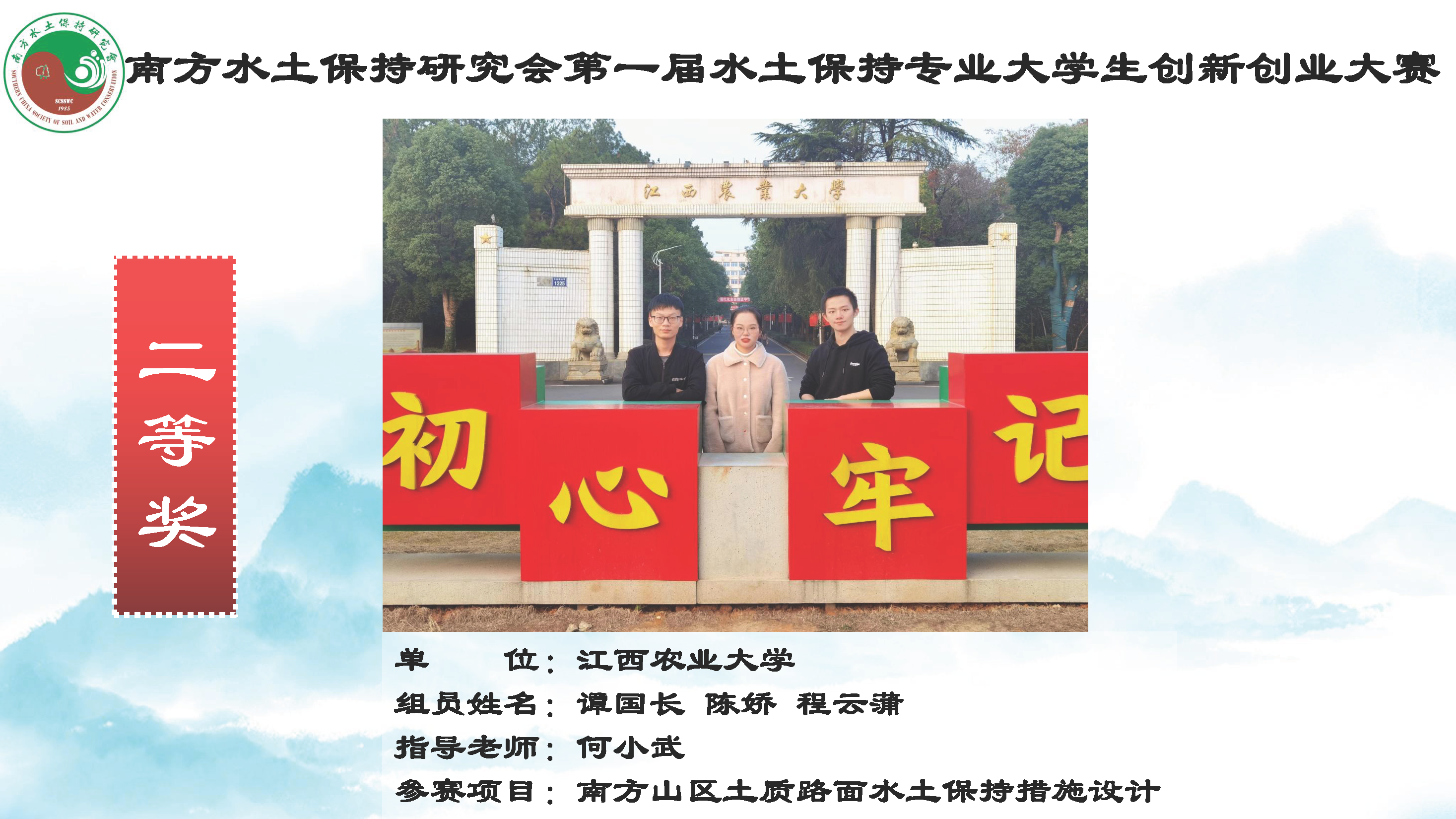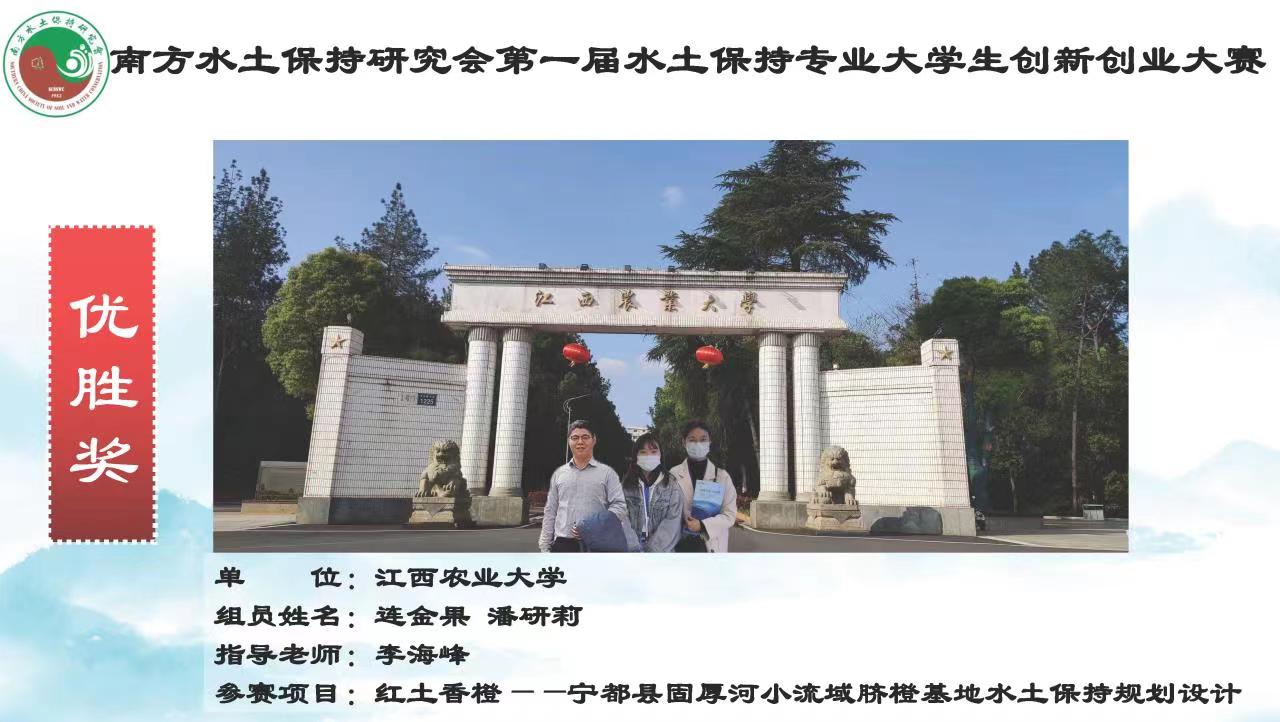 2022年12月3日,南方水土保持研究会第一届水土保持专业大学生创新创业大赛颁奖仪式以线上形式成功举行,历时半年多的大赛圆满落幕。由我院学生谭国长、陈娇、程云蒲(指导老师:何小武)完成的参赛作品《南方山区土质路面水土保持措施设计》荣获本次大赛本科生组“二等奖”,我院学生连金果、潘研莉(指导老师:李海峰)完成的参赛作品《红土香橙——宁都县固厚河小流域脐橙基地水土保持规划设计》荣获大赛研究生组“优胜奖”。