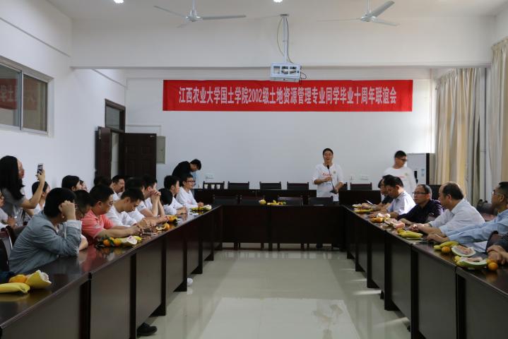 1023日,我院2002级土地资源管理专业全体校友回母校开展毕业十周年联谊会,并在国土学院二楼会议室举行了师生座谈交流活动。学院院长李保同教授、院党委书记郭旭、院党委副书记赵刚、任课老师代表陈美球教授、牛德奎教授、周阳教授、蔡海生教授、周丙娟副教授及原国土学院团委书记陈家兴老师等出席座谈会。李保同院长代表学院致欢迎词并向校友们表达了深切的寄语。因班主任王景明老师外出无法参加座谈,陈家兴老师代为宣读了王老师对同学们毕业十周年聚会的致辞。周阳老师、陈美球老师代表任课老师发言,从如何延续同学情、走好人生路等方面表达了对校友们的殷切期望。校友们在聆听师长的谆谆教诲后,逐一向老师们汇报了各自毕业十年来的工作、家庭及生活等方面的情况,并表示一定会继续加强与学校的沟通与联系,特别是在毕业生实习和就业方面将给予母校的学弟、学妹们提供更多的帮助。随后,2002级土地资源管理专业全体校友们向国土学院赠送了一套乒乓球桌,以丰富老师们的业余生活,并向老师们赠送了“感谢师恩”毕业十周年特制纪念品。
